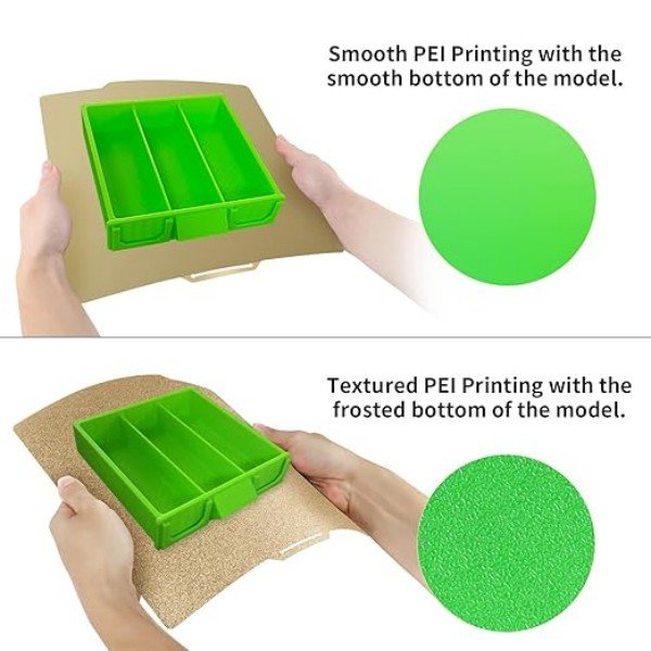 - 両面スムース&テクスチャーPEIビルドプレートデザイン:片面はスムースPEIプリントベッド表面で、プリントモデルの底面はスムースで、モデルの取り外しとクリーニングが簡単です。もう一方の面はPEIつや消し表面プレートで、つや消しステッカー表面に独特のつや消しタッチを与え、モデルへの密着性を高め、ゆがむことなくプリントできます。