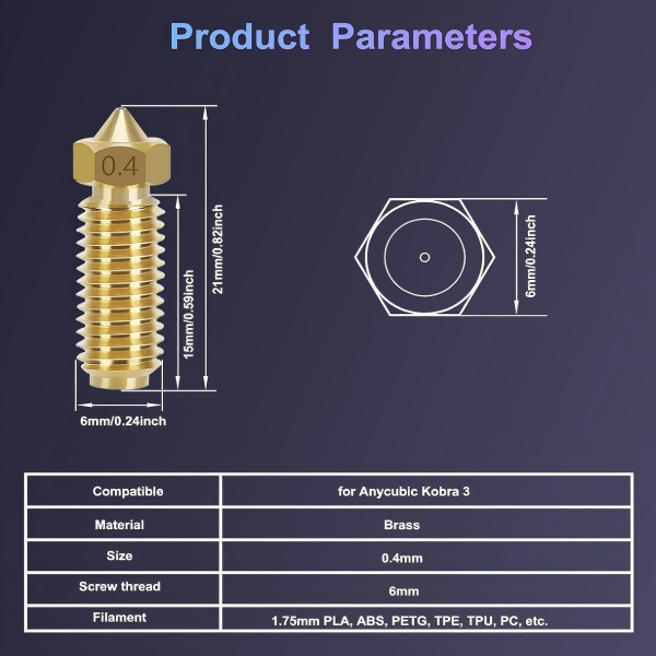 - High Quality: Made of durable heat-resistant and wear-resistant brass, long-lasting and not easy to clog, compatible with PLA, ABS, PETG, TPE, TPU,PC and other filament materials.