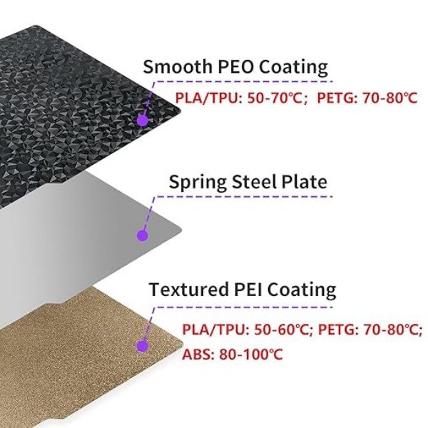 - Support Various Filaments:For PEO build plate we suggest PLA, TPU, PETG. (The corresponding temperature PLA/TPU: 50-70℃; PETG: 70-80℃. PEI surface can prints PLA, PETG, ABS, TPU, ASA, PVA, PET, PA, PC etc.(The recommend temperature of PEI side is PLA/TPU: 50-60℃; PETG: 70-80℃; ABS: 80-100℃. If printing high-temperature filaments such as ABS, it is recommended to use the enclosure for printing or apply glue on the hot bed to assist with adhesion.