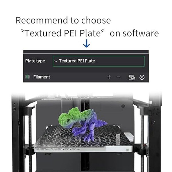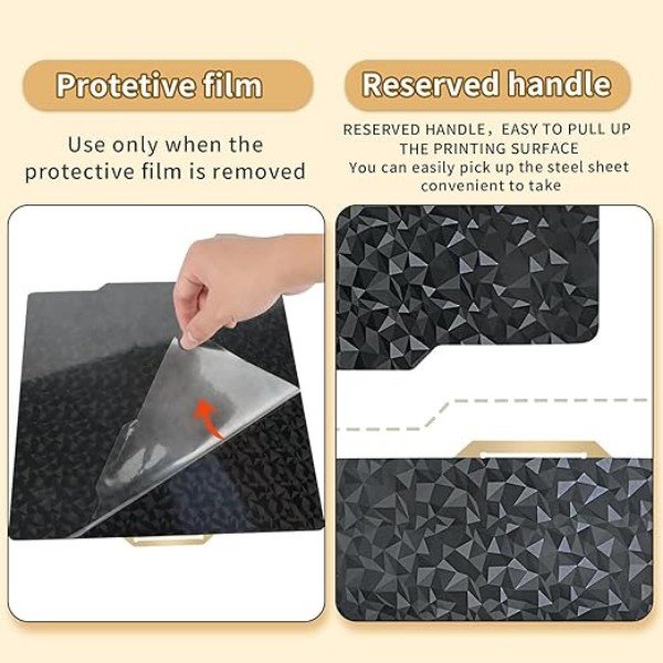 - Double Sided SmoothPEO+Textured PEI Build Plate:The spring steel bed plate is come with 2 printing textures. One side is PEO surface which can print excellent mosaic pattern. Other side is textured PEI which can print frosted models.
