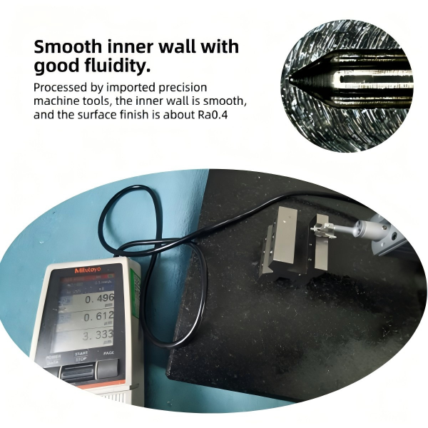Precision-machined by imported high-precision machine tools, the nozzle features an ultra-smooth inner wall with a surface roughness of approximately Ra 0.4. This design minimizes material flow resistance, enabling smooth and consistent filament movement during printing.